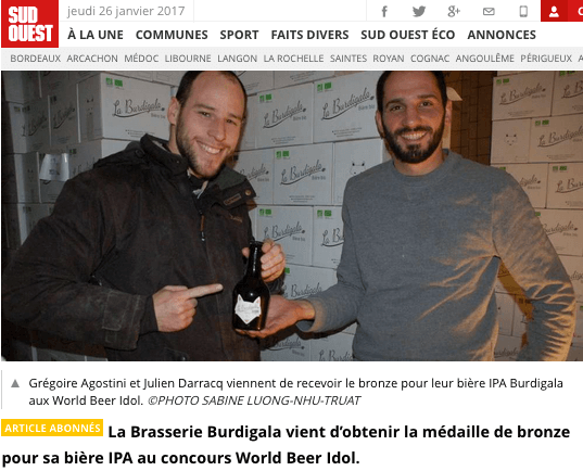 Et voici l’article du Sud Ouest du 25 Janvier 2017 faisant suite à la médaille de bronze des World Beer Idol 2017 décrochée par la Brasserie Burdigala pour son IPA. C’est également l’occasion pour nous d’officialiser l’arrivée du 2ème brasseur de La Burdigala depuis Octobre dernier: Julien Darracq 🙂